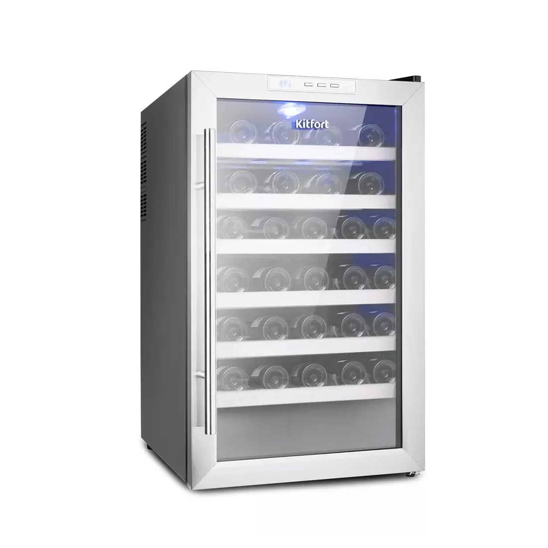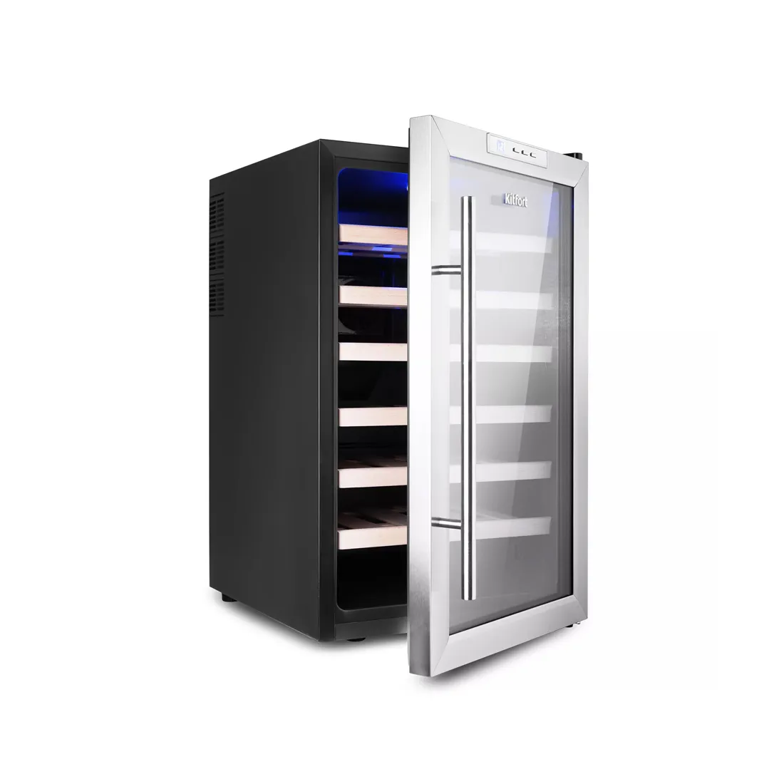 Устройство Kitfort KT-2410 оснащено дисплеем с индикацией температуры и голубой LED-подсветкой камеры. Вы можете регулировать температуру в шкафу в диапазоне от 12°C до 18°C. Предусматривается наличие прочного металлического корпуса, удобных деревянных полок и прозрачной стеклянной двери с защитой от УФ-лучей. Оборудование весит 21 кг, а его размеры составляют 43×72.6×51 см.