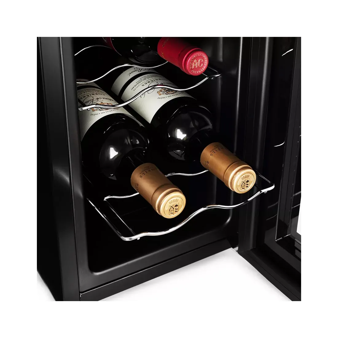 В винном шкафу 3 полки из хромированной стали, на каждой полке помещается по 2 бутылки, ещё 2 бутылки можно расположить на дне. Бутылки правильно хранить горизонтально. Пробка касается вина и не позволяет кислороду проникнуть внутрь.