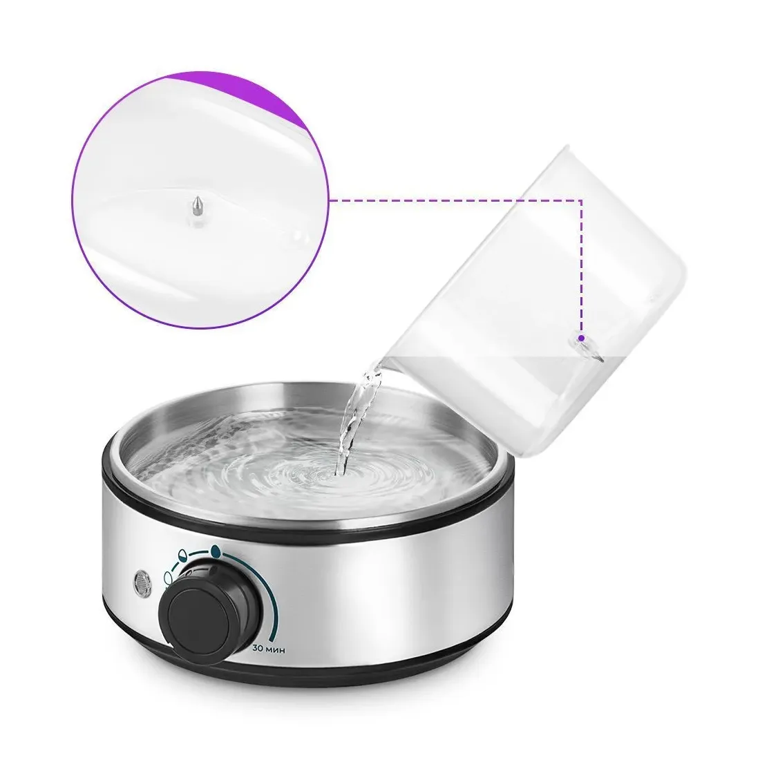 В корпусе яйцеварки находится резервуар для воды ёмкостью 200 мл. Мерный стакан поможет налить вам точное количество воды в резервуар. В дно стаканчика встроена игла, с помощью которой можно проколоть скорлупу, будьте осторожны!